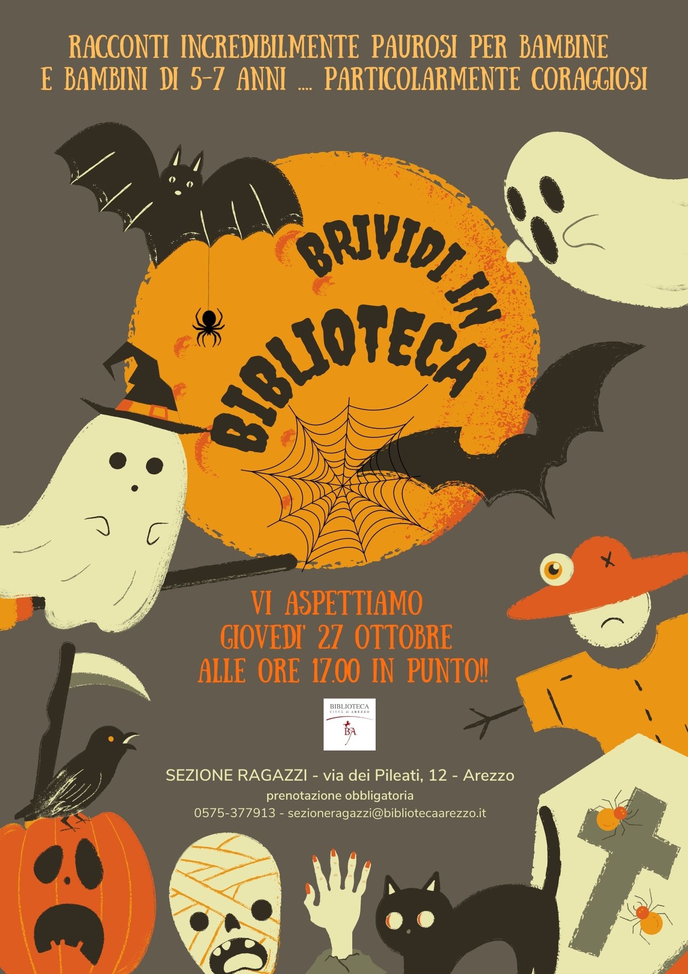 La notte di Halloween è da sempre uno dei momenti più attesi dai bambini, che possono travestirsi e giocare con la paura per esorcizzarla e trasformarla in un’esperienza divertente. Nell’attesa dell’evento, la Sezione Ragazzi della Biblioteca Città di Arezzo organizza una lettura di racconti nella penombra delle sue antiche mura, evocando streghe e fantasmi svolazzanti tra scaffali e volumi. Gli albi illustrati saranno scelti con cura per far vivere tante emozioni ai coraggiosissimi piccoli lettori.