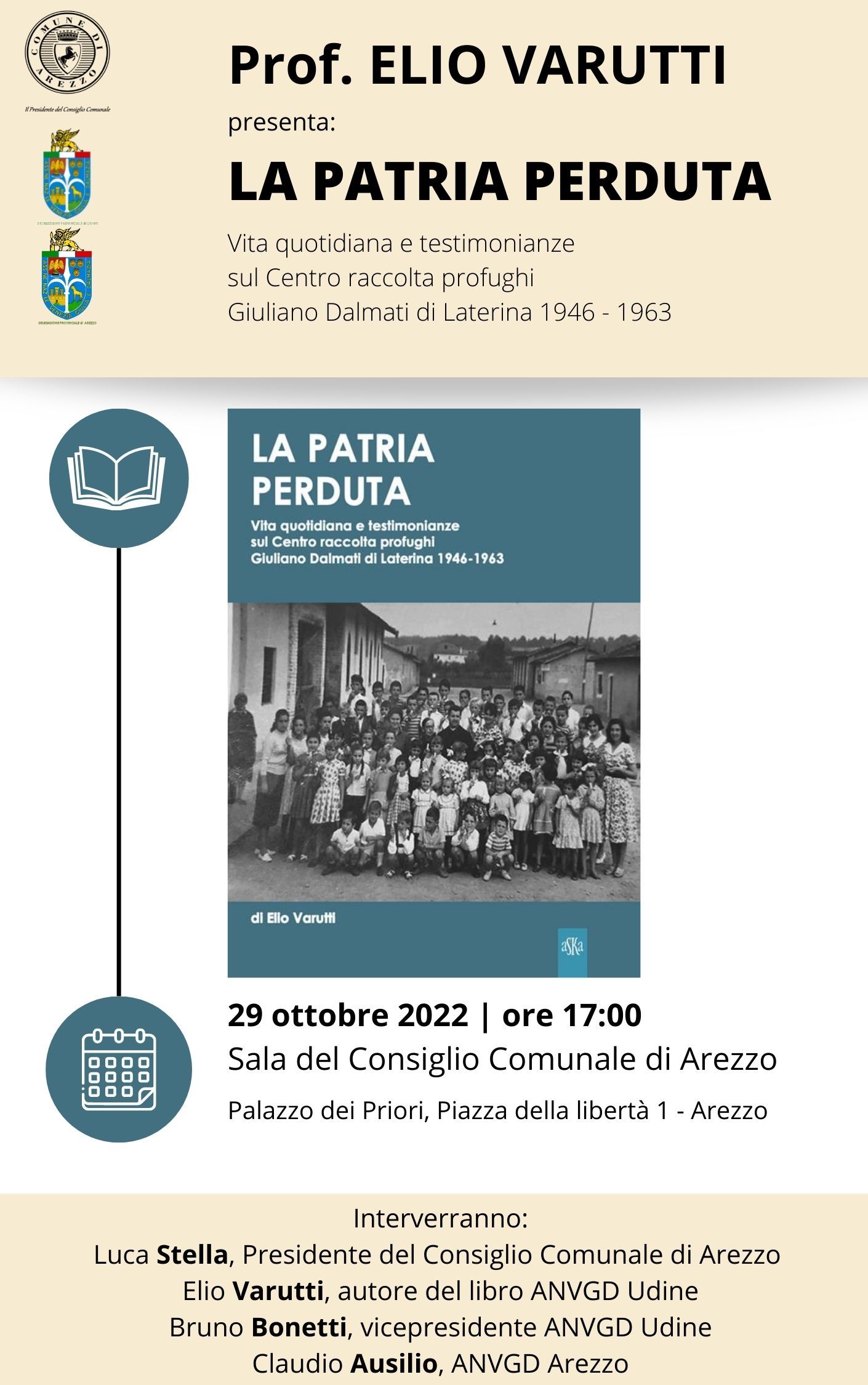 Si terrà sabato 29 ottobre alle 17 nella sala consiliare, organizzata dalla Presidenza del Consiglio Comunale, la presentazione del libro "La patria perduta. Vita quotidiana e testimonianze sul Centro raccolta profughi Giuliano Dalmati di Laterina 1946 – 1963" (Aska, Firenze).