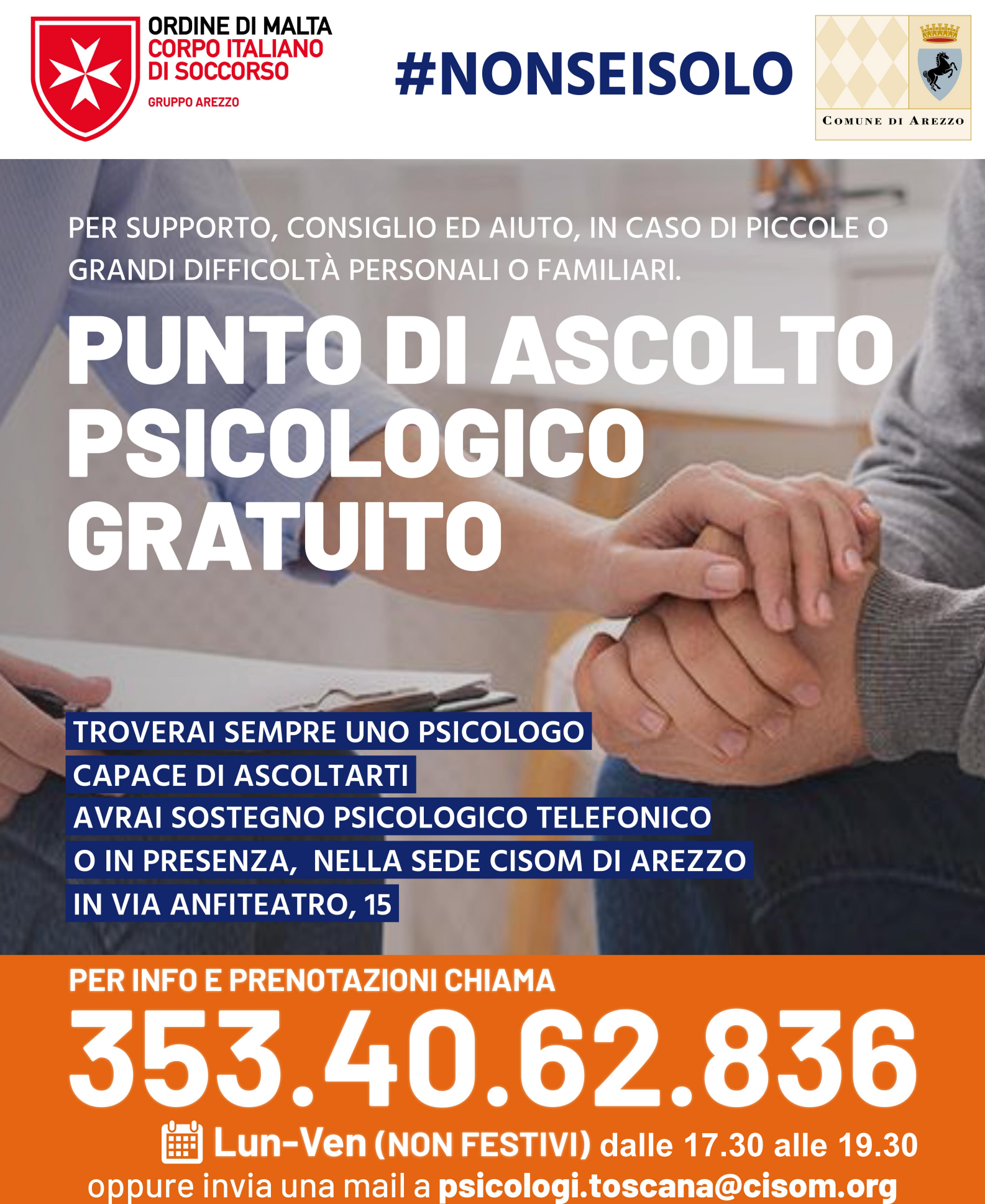 "Abbiamo accolto con favore il progetto dell'Ordine di Malta per la costituzione di un punto di ascolto psicologico, un luogo di accoglienza dedicato al miglioramento del benessere psicosociale personale e familiare per rispondere a situazioni di disagio e di difficoltà. Ringraziamo la Fondazione CISOM per la disponibilità ad attivare un servizio che contribuisce ad arricchire la risposta in termini di generosità, sostegno e di aiuto che caratterizza l'impegno del terzo settore". Il vice sindaco Lucia Tanti presenta così l'iniziativa "Punto di Ascolto Psicologico" organizzata, in collaborazione con la Diocesi, dalla Fondazione Corpo Italiano di Soccorso dell'Ordine di Malta CISOM, socio della Fondazione Arezzo Comunità, che a partire dal 22 febbraio e per la durata di 12 mesi opererà in via dell'Anfiteatro 15.