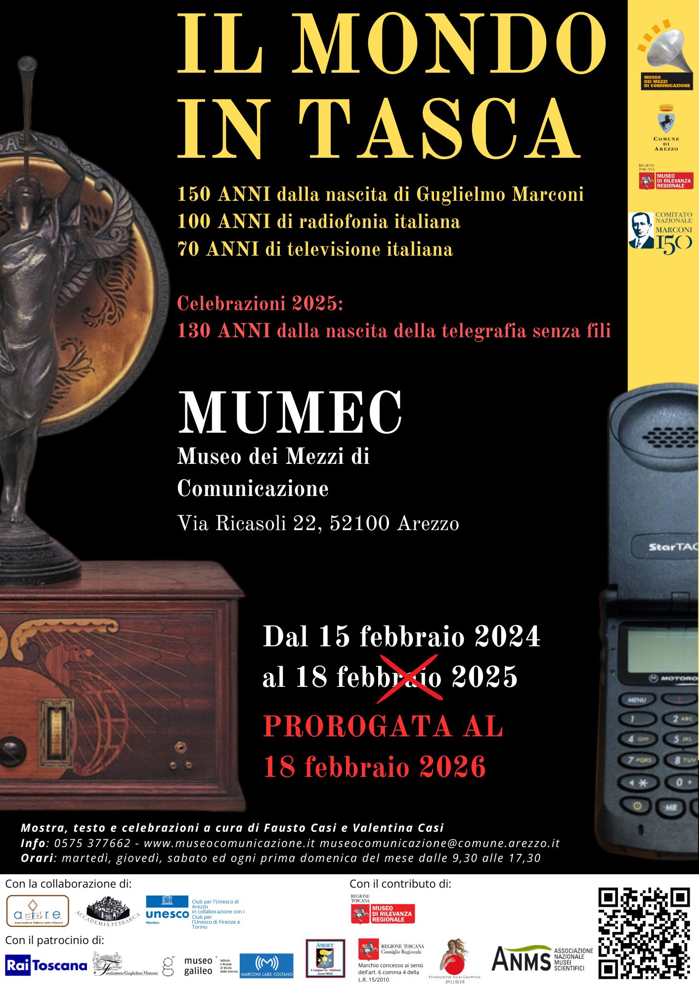 • dal 16 febbraio 2024 al 15 febbraio 2025: Apertura della mostra "Il Mondo in tasca" - 150 anni dalla nascita di Guglielmo Marconi, 100 anni di radiofonia in Italia, 70 anni di RAI Radiotelevisione Italiana