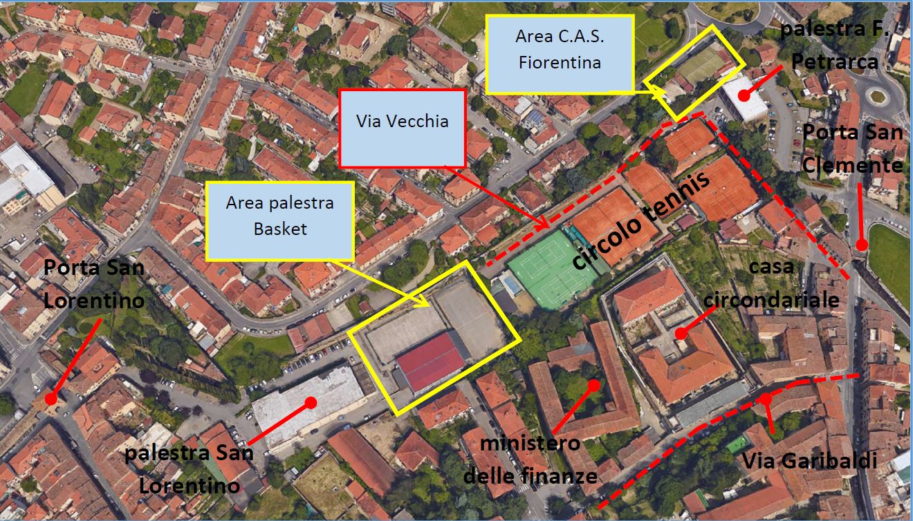 Veniamo all’articolazione dei due lotti. "Con il primo, il focus si stringerà sull’ex campo da basket, oramai in disuso da anni. Un impianto che ha dunque esaurito la funzionalità. Dopo la sua demolizione, sorgeranno un’area a verde pubblico e parcheggi, utili per chi vorrà andare al palazzetto di San Lorentino che resterà la vera attrazione sportiva nella parte sud dell’area e beneficerà del recente restyling che abbiamo eseguito. Scompariranno anche gli altri campi da calcio e pattinaggio, oramai impraticabili. Con il secondo lotto, arriverà il momento dei locali del centro di aggregazione sociale Fiorentina ubicati nel bastione di San Clemente. Anche per questi edifici è prevista la demolizione per destinare l’area a una funzione più coerente con il contesto storico. Peraltro, questo ci permetterà di togliere l’eternit ancora presente sulla copertura del Cas e provvedere così a un’ulteriore bonifica. Vorremmo rassicurare peraltro i responsabili e i soci del centro stesso sul nostro impegno a trovare una sede alternativa adeguata alla prosecuzione dell’importante attività sociale svolta".